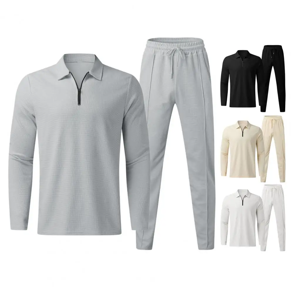 Upptäck tvådelat träningsset: Klassisk krage, långärmad topp och byxor för en tidlös stil.