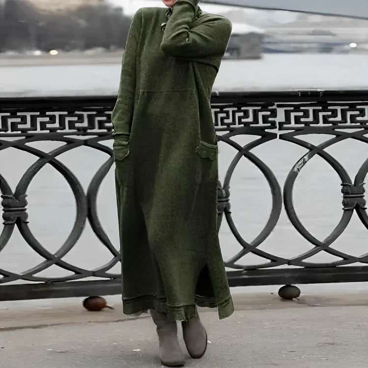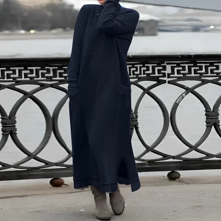 Ge din mode en boost med den Stiliga Långa Klänningen. Designad för höst och vinter, kombinerar denna klänning bekvämlighet och stil på ett smidigt sätt. Från och med nu behöver du aldrig offra stilen för att hålla dig varm igen!